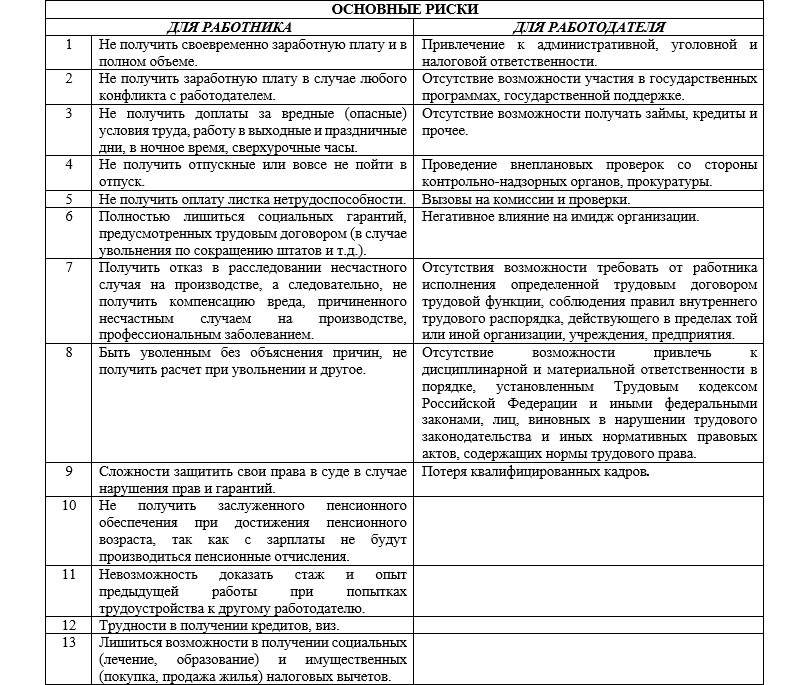 Зарплата в «конвертах» или неоформленный трудовой договор – это будущее без гарантий и уверенности. Необходимо сегодня заботиться о своем «завтра» и не соглашаться на получение нелегальной заработной платы и неоформленные трудовые отношения. Не позволяйте работодателям забывать о своей ответственности за уровень социальной защищенности своих работников.
